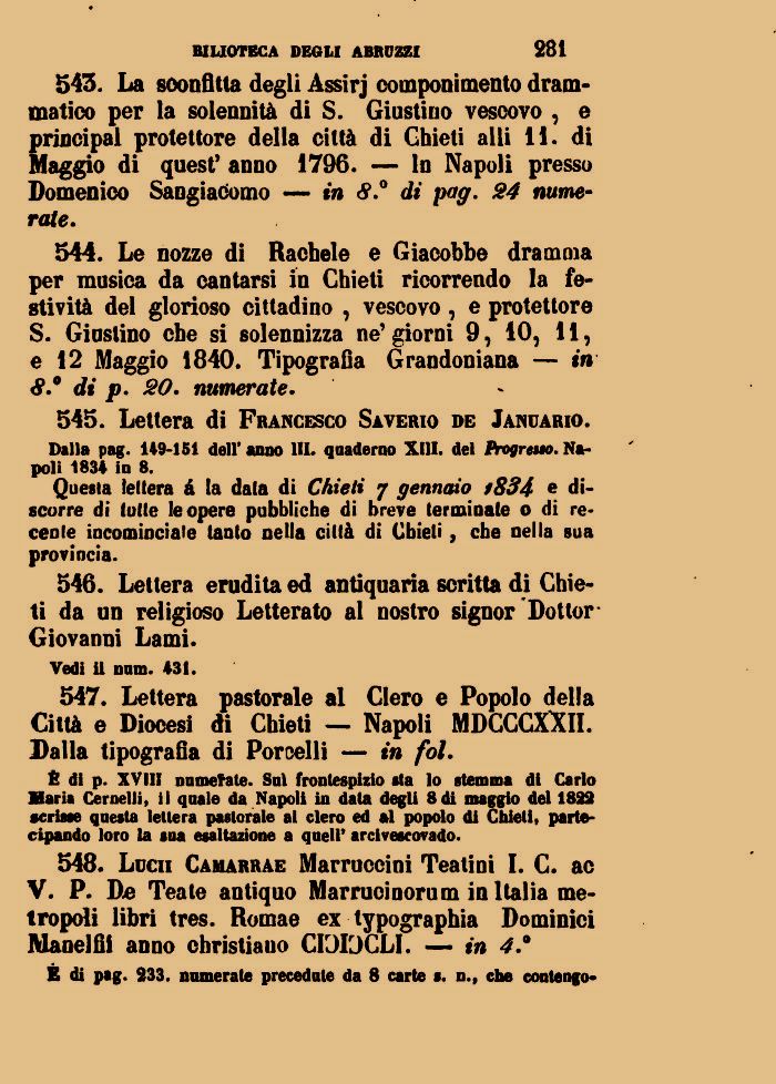 544. Le nozze di Rachele e Giacobbe dramma per musica da cantarsi in Chieti ricorrendo la festività del glorioso cittadino , vescovo , e protettore S. Giustino che si solennizza ne' giorni 9, 10, 11, e 12 Maggio 1840. Tipografia Grandoniana — in .° di p. 20. numerate.