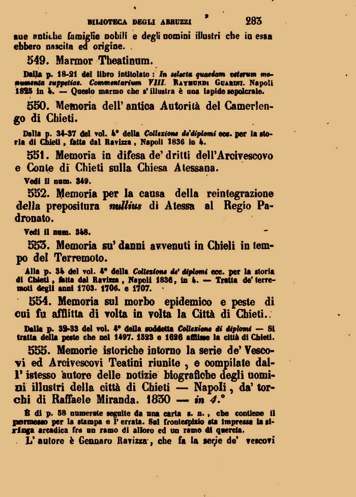 555. Memorie istoriche intorno la serie de' Vescovi ed Arcivescovi Teatini riunite , e compilate dall' istesso autore delle notizie biografiche degli uomini illustri della città di Chieti — Napoli, da' torchi di Raffaele Miranda. 1850 — in 4