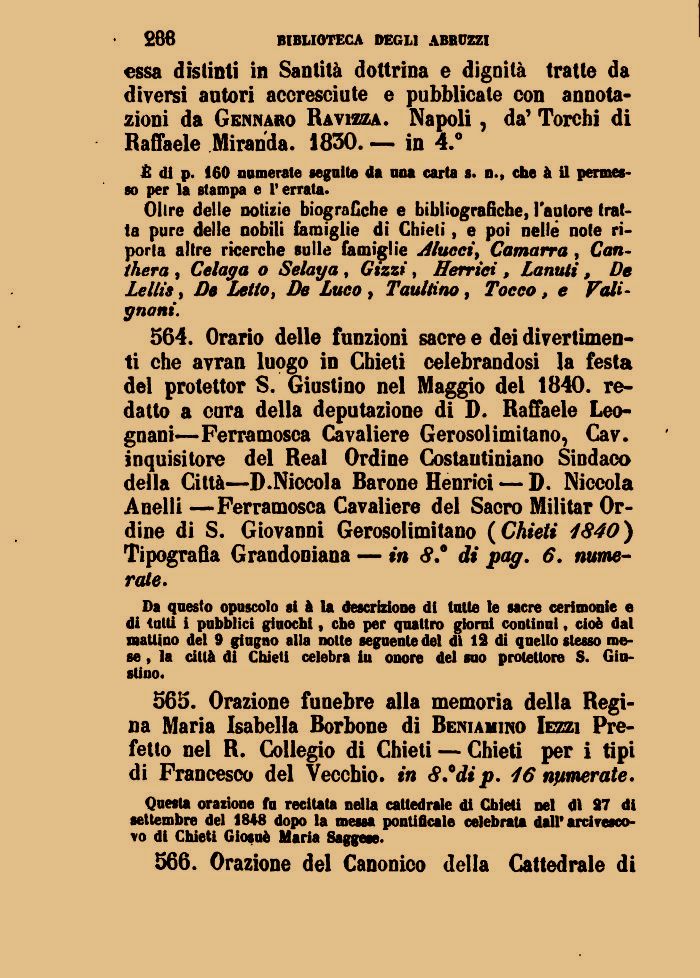 564. Orario delle funzioni sacre e dei divertimenti che avran luogo in Chieti celebrandosi la festa del protettor S. Giustino nel Maggio dei 1840. redatto a cura della deputazione di D. Raffaele Leo-gnani—Ferramosca Cavaliere Gerosolimitano, Cav. inquisitore del Real Ordine Costantiniano Sindaco della Città—D.Niccola Barone Henrici — D. Niccola Anelli —Ferramosca Cavaliere del Sacro Militar Ordine di S. Giovanni Gerosolimitano (Chieti 1840) Tipografia Grandoniana — in 8.° di pag. 6. nume-rate.
