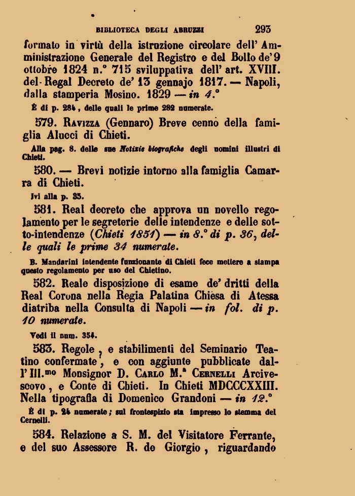 583. Regole ? e stabilimenti del Seminario Teatino confermate, e con aggiunte pubblicate dall'III.mo Monsignor D. Carlo M.a Cervelli Arcivescovo , e Conte di Chieti. In Chieti MDCCCXXIII. Nella tipografia di Domenico Grandoni — in 12.°