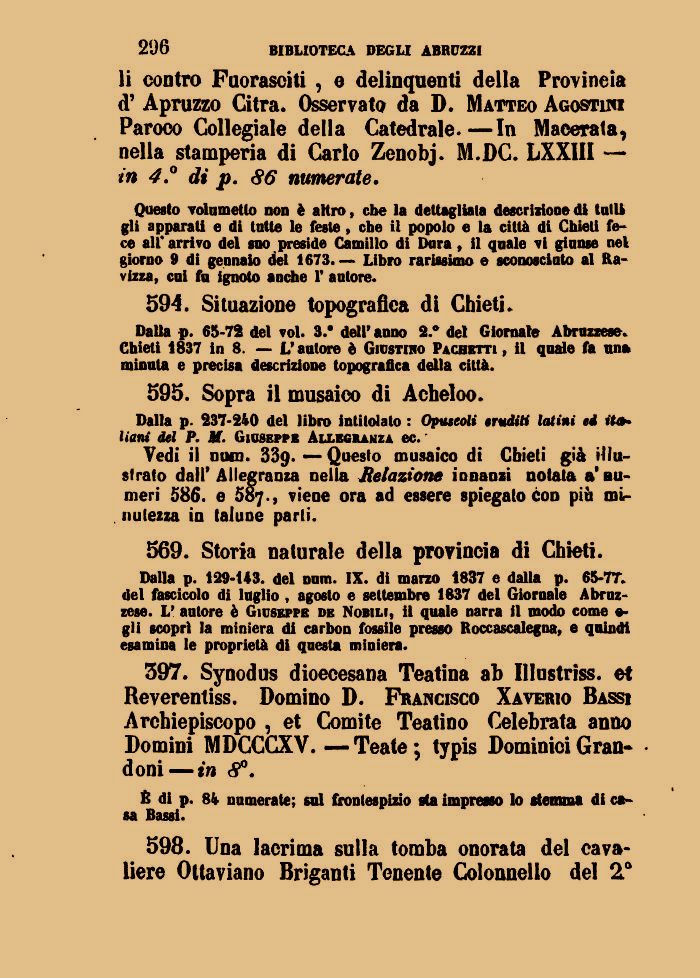 597. Synodus dioecesana Teatina ab Illustriss. et Reverentiss. Domino D. Francisco Xaverio Bassi Archiepiscopo , et Comite Teatino Celebrata anno Domini MDCCCXV. — Teate ; typis Dominici Gran-doni— in