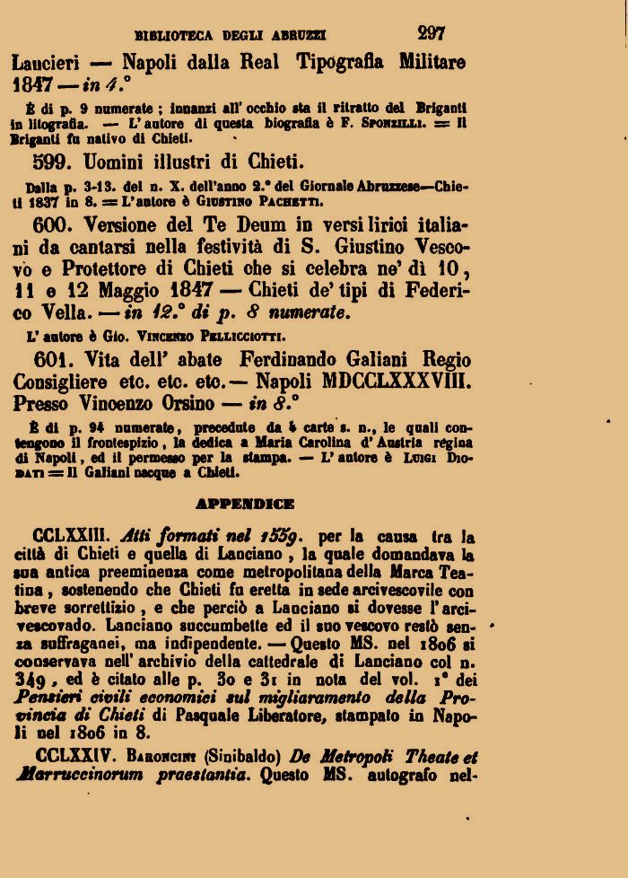 città di Chieti e quella di Lanciano , la quale domandava la sua antica preeminenza come metropolitana della Marca Teatina , sostenendo che Chieti fu eretta in sede arcivescovile con breve sorrettizio , e che perciò a Lanciano si dovesse l'arcivescovado. Lanciano succumbette ed il suo vescovo restò sen- * za suffragane'), ma indipendente. — Questo BIS. nel 1806 si conservava nell' archivio della cattedrale di Lanciano col n. 349 « ed è citato alle p. 3o e 3i in nota del voi. i° dei Pensièri civili economici sul miglioramento della Provincia di Chieti di Pasquale Liberatore, stampato in Napoli nel 1806 in 8.