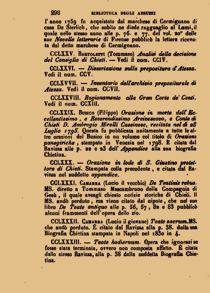 CCLXXXI1. Camahba (Lucio il giovane) Teate sacrum.MS. che andò perduto. É citato dal Ravizza alla p. 38. della sua Biografia Chietina stampata in Napoli nel i83o in 4»