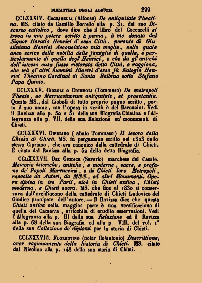 GCLXXXV. Cioboli o Ciomboli (Tommaso) De metropoli Theate, ac Marruccinorum antiquitate , et praestantia. Questo MS., dal Cioboli di tatto proprio pugno scritto, porta il suo nome, ma l'opera io verità è del Baroncini. Vedi il Ravizza alle p. 5o e 01 della sua Biografia Chietina e l'AI-legranza alla p. VII. della soa Relazione su1 monomenti di Cbieti.