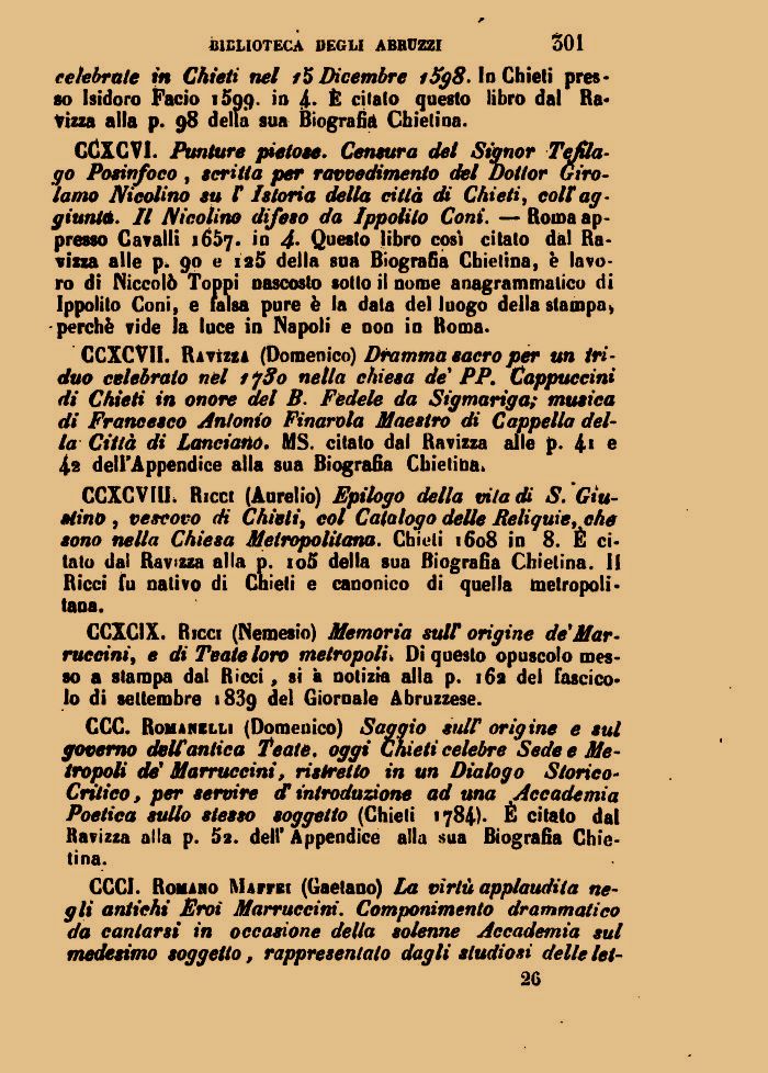 CCXCIX. Ricci (Nemesio) Memoria sull origine de'Marruccini, e di Teate loro metropoli» Di questo opuscolo messo a slampa dal Ricci, si à notizia alla p. 162 del fascicolo di settembre 1839 del Giornale Abruzzese.