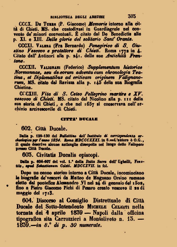 cktoloficuppr Fanno 1834. Roma MDCCCXXXJ. in 8.=L'autore è O.G., il quale descrive alcune anticaglie dissepolte nel luogo detto Vallopuco presso Città Ducale.