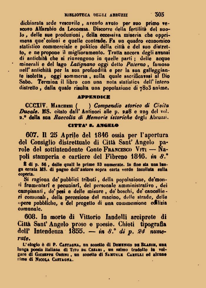 608. In morte di Vittorio Iandelli arciprete di Città Sant* Angelo prose e poesie. Chieti tipografia dell' Intendenza 1855. — in <9.° di p. 24 numerate.