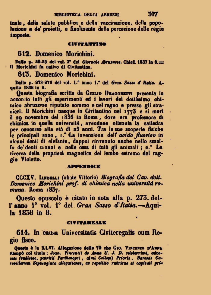 Questa biografia scritta da Giulio Dragonitti presenta in accorcio tatti gli esperimenti ed i lavori del dottissimo chimico abruzzese riputato sommo e nel regno e presso gli stranieri. Il Morichini nacque in Givitantino oel 1773 e si morì il 99 novembre del 1806 in Roma, dove era professore di chimica io quella università, avendone ottenuta la cattedra per concorso alla età di 95 anni. Tra le sue scoperte fisiche le principali sono, 1/ i.a invenzione dell' acido fiaorico in alcuni denti di elefante, dappoi rinvenuto anche nello snial-fo de'denti umani e nelle ossa di tutti gli animali ; 2.* La ricerca della proprietà magnetica del lembo estremo del raggio Violetto.