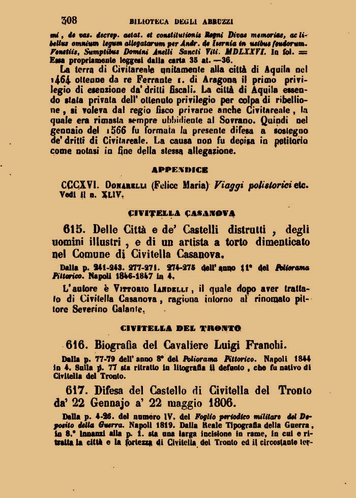 Della p. 4-26. del numéro IV. del Foglio periodico militare del Deposito dèlia Onerra. Napoli 1819. Dalla Reale Tipografia della Guerra, in 8.° Innanzi alla p. 1. sta una larga incisione In rame, in cui e ritratta la città e la fortezza di Civitella del Tronto ed il circostante ter-