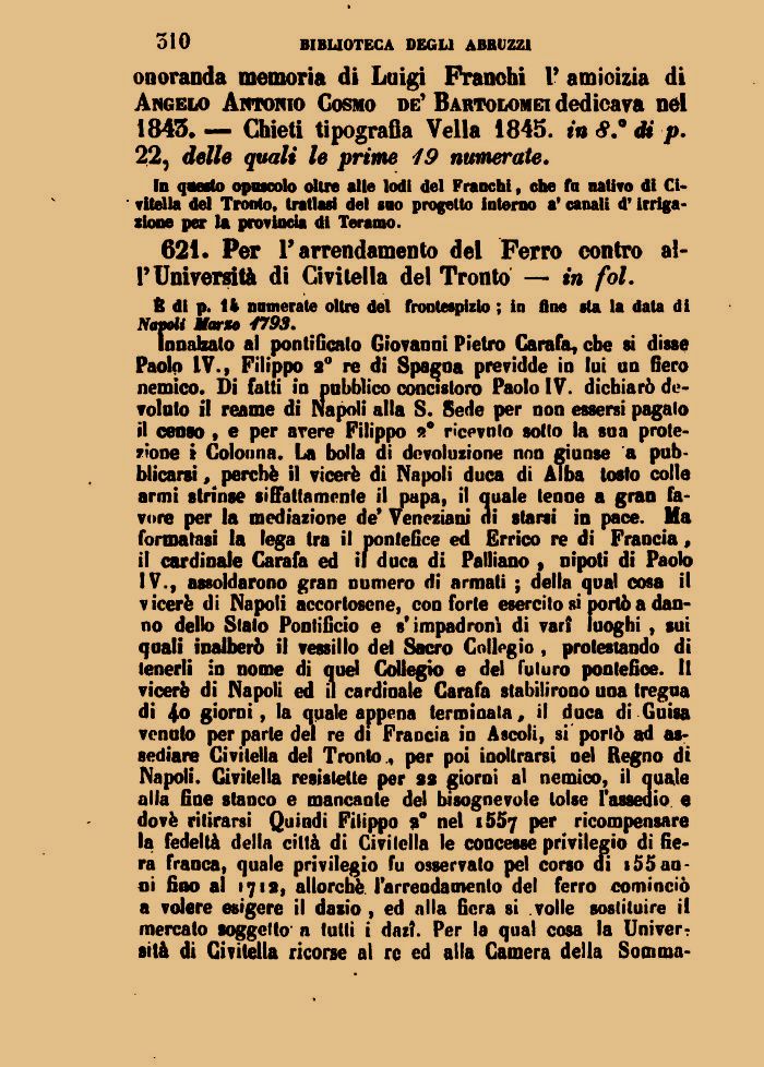 Innalzalo al pontificato Giovanni Pietro Carata, che si disse Paolo IV., Filippo a° re di Spagna previdde in Ini un fiero nemico. Di fatti in pubblico concistoro Paolo IV. dichiarò devoluto il reame di Napoli alla S. Sede per non essersi pagalo il censo * e per avere Filippo ricevuto sotto la sua protezione i Colonna. La bolla di devoluzione non giunse a pubblicarsi , perchè il viceré di Napoli duca di Alba tosto colle armi strìnse siffattamente il papa, il quale tenne a gran favore per la mediazione de' Veneziani ni starsi in pace. Ma formatasi la lega tra il pontefice ed Errico re di Francia, il cardinale Carafa ed il duca di Palliano , nipoti di Paolo IV., assoldarono gran numero di armati ; della qual cosa il viceré di Napoli accortosene, con forte esercito si portò a danno dello Stato Pontificio e s'impadronì di vari luoghi , sui quali inalberò il vessillo del Sacro Collegio , protestando di tenerli :n nome di quel Collegio e del futuro pontefice. Il viceré di Napoli ed il cardinale Carafa stabilirono una tregua di £o giorni, la quale appena terminala, il duca di Guisa venuto per parte del re di Francia in Ascoli, si portò ad assediare Civilella del Tronto., per poi inoltrarsi nel Regno dì Napoli. Givitella resistette per 22 giorni al nemico, il quale alla fine stanco e mancante del bisognevole tolse l'assedio e dovè ritirarsi Quindi Filippo 2° nel i557 per ricompensare la fedeltà della città di Civilella le concesse privilegio di fiera franca, quale privilegio fu osservato pel corso ai 155anni fino al 1712, allorché l'arreodamento del ferro cominciò a volere esigere il dazio , ed alla fiera si volle sostituire il mercato soggetto n tutti i dai?. Per la qual cosa la Uni ver? sità di Givitella ricorse al re ed alla Camera della Somma-