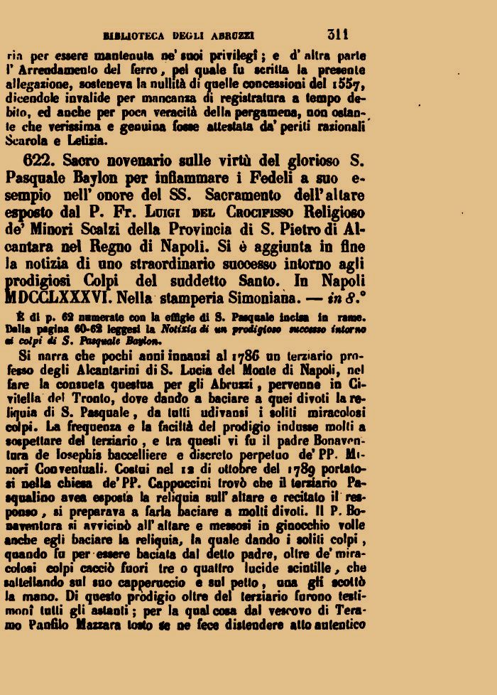 Si narra che pochi anni innanzi al 1786 un terziario professo degli Alcantarini di S. Lucia del Monte di Napoli, nel tiare la consueta questua per gli Abruzzi, pervenne in Ci-vitella dpi Tronto, dove dando a baciare a quei divoti la reliquia di S. Pasquale, da tolti udivansi i soliti miracolosi colpi. La frequenza e la faciltà del prodigio indusse molti a sospettare del terziario , e tra questi vi fu il padre Bonaventura de losepbis baccelliere e discreto perpetuo de' PP. Minori Conventuali. Costai nel 12 di ottobre del 1789 portatosi nella chiesa de' PP. Cappoccini trovò che il terziario Pasqualino avea esposta la reliquia sull'altare e recitato il responso , si preparava a farla oaciare a molti divoti. Il P. Bonaventura si avvicinò all'altare e messosi in ginocchio volle anche egli baciare la reliquia, la quale dando i soliti colpi, quando fa per essere baciata dal detto padre, oltre de* miracolosi colpi cacciò fuori tre o quattro lucide scintille , che saltellando sai sno capperuccio e sol petto, una gli scottò la mano. Di questo prodigio oltre del terziario furono testimoni tutti gli astanti ; per la qual cosa dal vescovo di Teramo Panfilo Mazzera tosto le ne fece distendere alto autentico