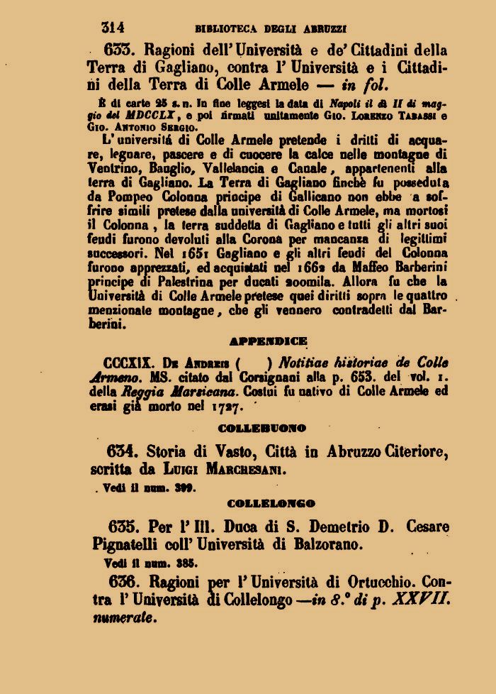 L'universi ti di Colle Armele pretende i dritti di acquare, legnare, pascere e di cuocere la calce nelle montagne di Yentrino, Bangi io, Vallelancia e Canale, appartenenti alla terra di Gagliano. La Terra di Gagliano finché fu posseduta da Pompeo Colonna principe di Gallicano non ebbe a soffrire simili pretese dalla università di Colle Armele, ma mortosi il Colonna , la terra suddetta di Gagliano e tutti gli altri suoi feudi furono devoluti alla Corona per mancanza di legittimi successori. Nel i65i Gagliano e gli altri feodi del Colonna furono apprezzati, ed acquistati nel i66s da Maffeo Barberini principe di Palestrina per ducati aoomita. Allora fu che la Università di Colle Armele pretese quei diritti sopra le quattro menzionate montagne, che gli vennero contradetti dal Barberini.