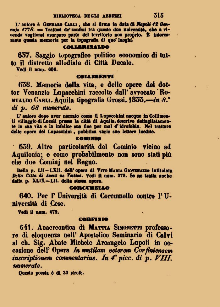 638. Memorie della vita, e delle opere del dottor Venanzio Lupacchini raccolte dall' avvocato Romualdo Carli. Aquila tipografia Grossi. 1833.—in 8.° di p. 68 numerate.
