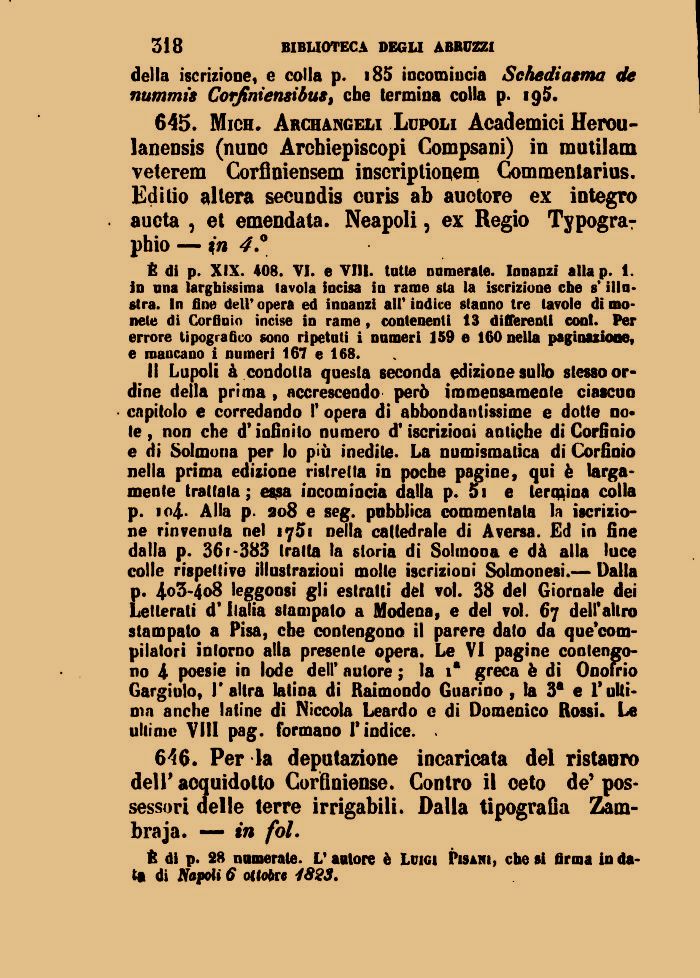 645. Mich. Archangeli Lupoli Academici Herou-lanensis (nuno Archiepiscopi Compsani) in mutilam veterem Corfiniensem inscriptionem Commentarius. Edilio altera secundis curis ab auctore ex integro aucta , et emendata. Neapoli, ex Regio Typogra-phio — in 4