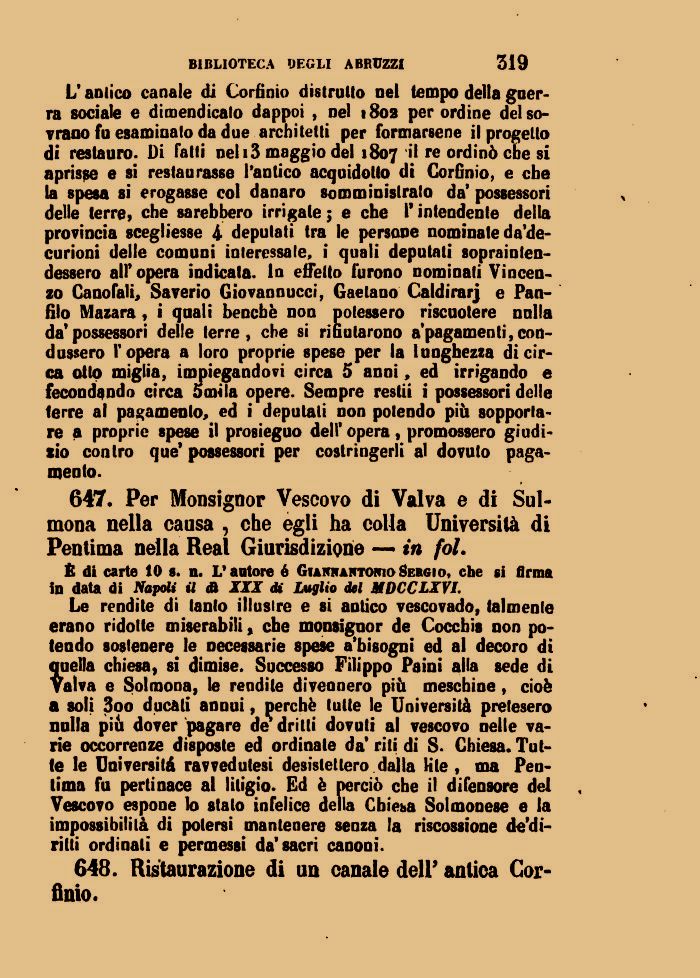 L'amico canale di Corfinio distrutto net tempo della guerra sociale e dimendicalo dappoi , nel 1802 per ordine del sovrano fu esaminalo da due architetti per formarsene il progetto di restauro. Di falli neli3 maggio del 1807 il re ordinò cbe si aprisse e si restaurasse l'antico acquidotto di Corfinio, e cbe la spesa si erogasse col danaro somministralo da' possessori delle terre, che sarebbero irrigate ; e che l'intendente della provincia scegliesse 4- deputali tra le persone nominale da'de-curioni delle comuni interessale, i quali deputati soprainlen-dessero all'opera indicala. In effetto furono nominati Vincenzo Canofali, Saverio Giovannucci, Gaetano Caldirarj e Panfilo Mazara , i quali bencbè non potessero riscuotere nolla da'possessori delle terre, cbe si rifiutarono appagamenti, condussero l'opera a loro proprie spese per la lunghezza di circa otto miglia, impiegandovi circa 5 anni, ed irrigando e fecondando circa 5mila opere. Sempre restii i possessori delle terre al pagamento, ed i deputali non polendo più sopportare a proprie spese il prosieguo dell' opera, promossero giudi-zio contro que' possessori per costrìngerli al dovuto pagamento.