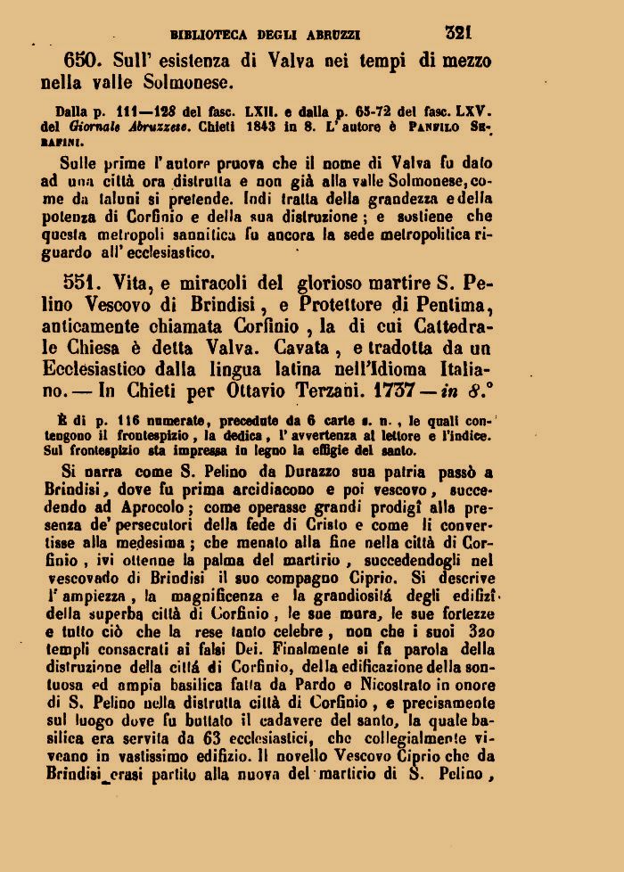 551. Vita, e miracoli del glorioso martire S. Pelino Vescovo di Brindisi, e Protettore di Pentima, anticamente chiamata Corfinio , la di cui Cattedrale Chiesa è detta Valva. Cavata, e tradotta da un Ecclesiastico dalla lingua latina nell'Idioma Italiano.— In Chieti per Ottavio Terzani. 1737 — in