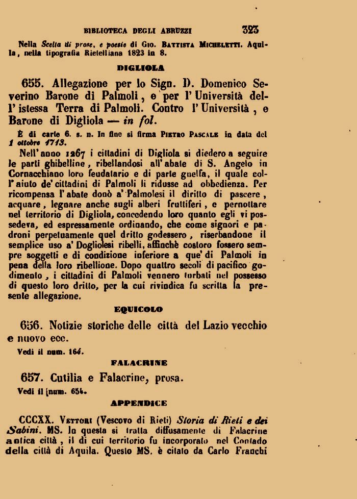 CCCXX. Vettori (Vescovo di Rieti) Storia di Rieti e dei Sabini. MS. lo questa si tratta diffusamente di Falacrine antica città , il di cui territorio fu incorporato nel Contado della città di Aquila. Questo MS. è citato da Carlo Fianchi