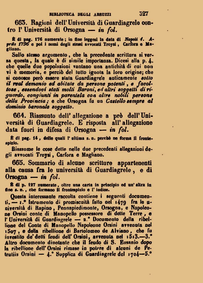 Sullo stesso argomento, che la precedente scrittura si versa questa, la quale è di simile importanza. Dicesi alla p. 4* che quelle due popolazioni vantano una antichità di cui noti vi è memoria, e perciò del lutto ignota la loro origine; che si conosce però essere stata Guardiagrele anticamente sotto il real demanio ed abitala da persone potenti, e facoltose , essendovi stati molli Baroni, ed altri soggetti di ri• guardo, congiunti in parentela eoa altre nobili persone della Provincia; e che Orsogna fu un Castello sempre al dominio baronale soggetto.