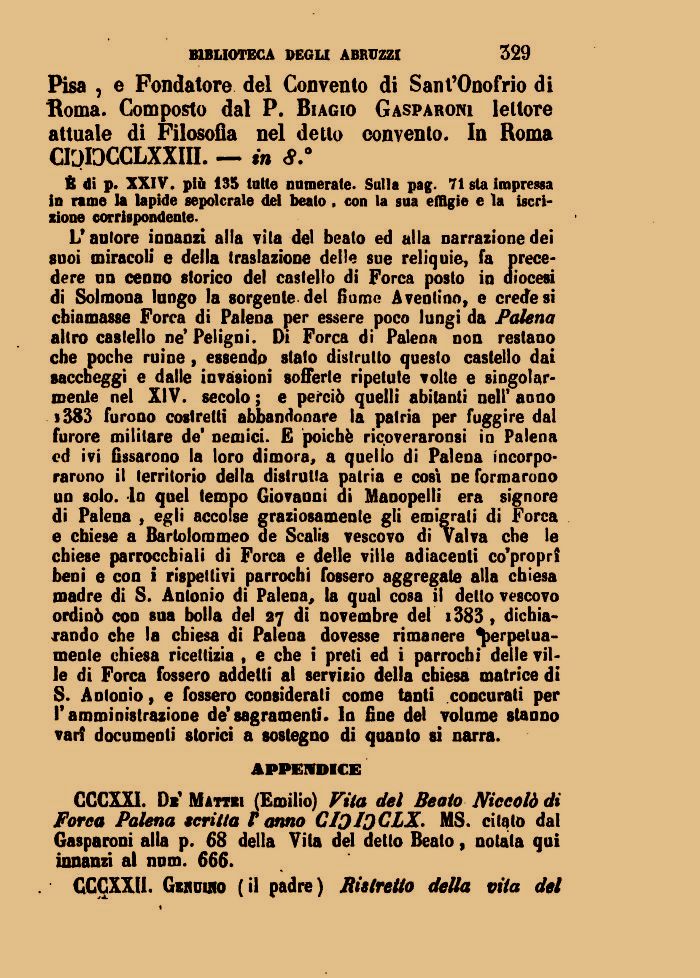 L'autore ianaozi alla vita del beato ed alla narrazione dei suoi miracoli e della traslazione delle sue reliquie, fa precedere un cenno storico del castello di Forca posto in diocesi di Solmona lungo la sorgente del fiume Aventino, e crede si chiamasse Forca di Palena per essere poco lungi da Falena altro castello ne' Peligni. Di Forca di Palena non restano che poche ruine , essendo stato distrutto questo castello dai saccheggi e dalle invasioni sofferte ripetute volte e singolarmente nel XIV. secolo ; e perciò quelli abitanti nell' aono i383 furono costretti abbandonare la patria per fuggire dal furore militare de' nemici. E poiché ricoveraronsi in Palena ed ivi fissarono la loro dimora, a quello di Palena incorporarono il territorio della distrutta patria e così ne formarono un solo, lo quel tempo Giovanni ai Maoopelli era signore di Palena , egli accolse graziosamente gli emigrati di Forca e chiese a Bartolommeo de Scalis vescovo di Valva che le chiese parrocchiali di Forca e delle ville adiacenti co'propri beni e con i rispettivi parrochi fossero aggregate alla chiesa madre di S. Antonio di Patena, la qual cosa il detto vescovo ordinò con sua bolla del 27 di novembre del 1383 , dichiarando che la chiesa di Palena dovesse rimanere ^>erpelua-meote chiesa ricettizia , e che i preti ed i parrochi delle ville dì Forca fossero addetti al servizio della chiesa matrice di S. Antonio, e fossero considerati come tanti concurati per T amministrazione de'sagramenti. In fine del volume stanno varJ documenti storici a sostegno di quanto si narra.