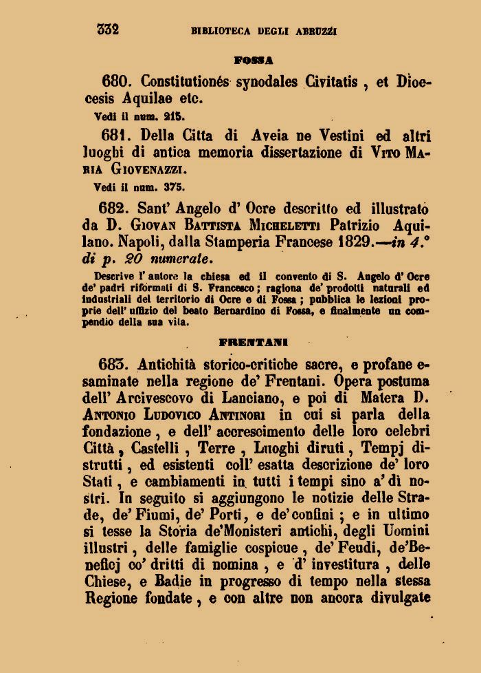 685. Antichità storico-critiche sacre, e profane e-saminate nella regione de' Frentani. Opera postuma dell' Arcivescovo di Lanciano, e poi di Matera D. Antonio Ludovico Antinori in cui si parla della fondazione, e dell' accrescimento delle loro celebri Città, Castelli , Terre , Luoghi diruti, Tempj distrutti , ed esistenti coli' esatta descrizione de' loro Stati, e cambiamenti in tutti i tempi sino a' dì nostri. In seguito si aggiungono le notizie delle Strade, de'Fiumi, de' Porti, e de'conQni ; e in ultimo si tesse la Storia de'Monisteri antichi, degli Uomini illustri, delle famiglie cospicue, de' Feudi, de'Be-neficj co' dritti di nomina , e d'investitura , delle Chiese, e Badie in progresso di tempo nella stessa Regione fondate, e con altre non ancora divulgate
