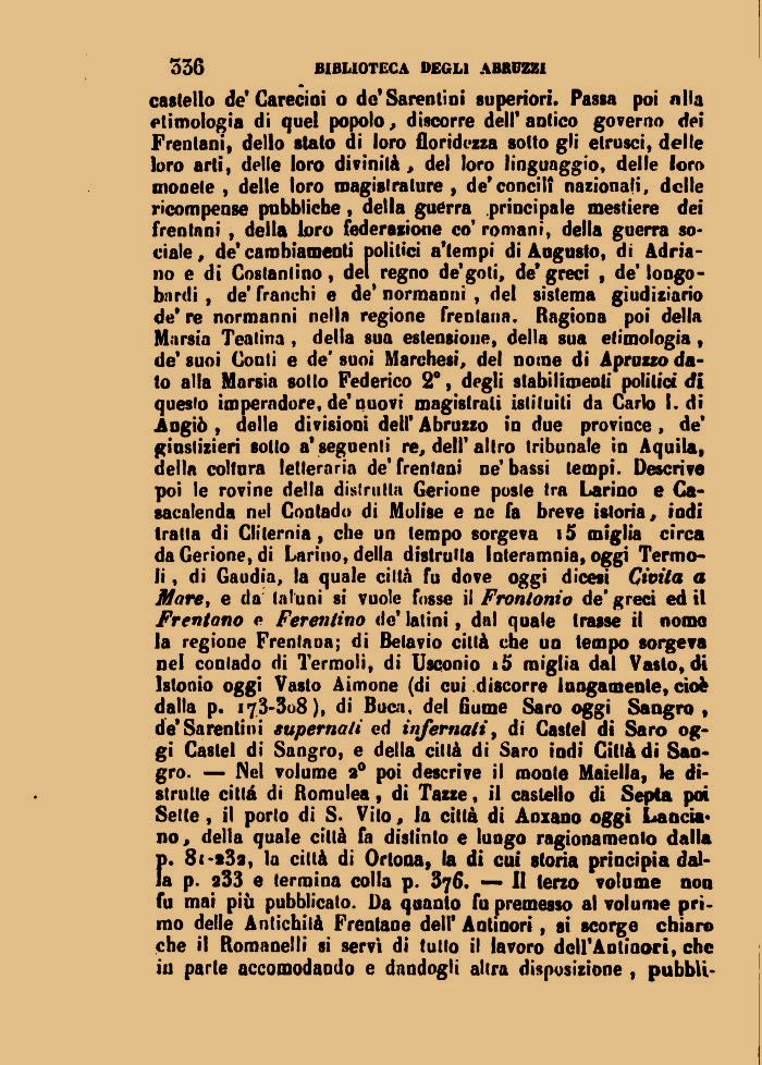 castello de Carecioi o de'Sarentini superiori. Passa poi «Ha etimologia di quel popolo, discorre dell'antico governo dei Frentani, dello stato di loro floridezza sotto gli etrusci, delle loro arti, delle loro divinità , del loro linguaggio* delle loro monete , delle loro magistrature , de*concili nazionali, delle ricompense pubbliche, della guerra principale mestiere dei frentani , della loro federatone co' romani, della guerra sociale , de'cambiamenti politici a'tempi di Augusto, di Adriano e di Costantino, dei regno de'goti, de' greci , de' longobardi , de' franchi e de' normanni , del sistema giudiziario de* re normanni nella regione frentana. Ragiona poi della Marsia Teatina , della sua estensione, della sua etimologia, de' suoi Conti e de' suoi Marchesi, del nome di Apruzzo dato alla Marsia sotto Federico 2°, degli stabilimenti politici di questo imperadore, de'nuovi magistrali istituiti da Carlo I. di Angiò , delle divisioni dell' Abruzzo io due province > de* giustizieri sotto a'seguenti re, dell'altro tribunale in Aquila, della coltura letteraria de' frentani ne' bassi tempi. Descrìve poi le rovine della distrutta Gerione poste tra Larino e Ca-sacalenda nel Contado di Molise e ne fa breve istoria, iodi tratta di Cliternia , che un tempo sorgeva i5 miglia circa da Gerione, di Larino, della distrutta Interamnia, oggi Termoli , di Gaudia, la quale città fu dove oggi dicesi Civita a Mare, e da taluni si vuole fosse ii Fronlonio de'greci ed il Frentano e Ferentino de' latini, dal quale trasse il nomo la regione Frentana; di Belavio città che un tempo sorgeva nel contado di Termoli, di Usconio i5 miglia dal Vasto, di Istonio oggi Vasto Aimone (di cui discorre lungamente, cioè dalla p. i73-3o8 ), di Buca, del fiume Saro oggi Saagro » de'Sarentini superna/i ed infornati, di Castel di Saro oggi Castel di Sangro, e della città di Saro iodi Città di Sao-grò. — Nel volume 2° poi descrive il monte Maiella, le distrutte città di Romulea, di Tazze, il castello di Sepia poi Sette , il porto di S. Vito, la città di Anxano oggi Lancia* no, della quale città fa distinto e lungo ragionamento dalla