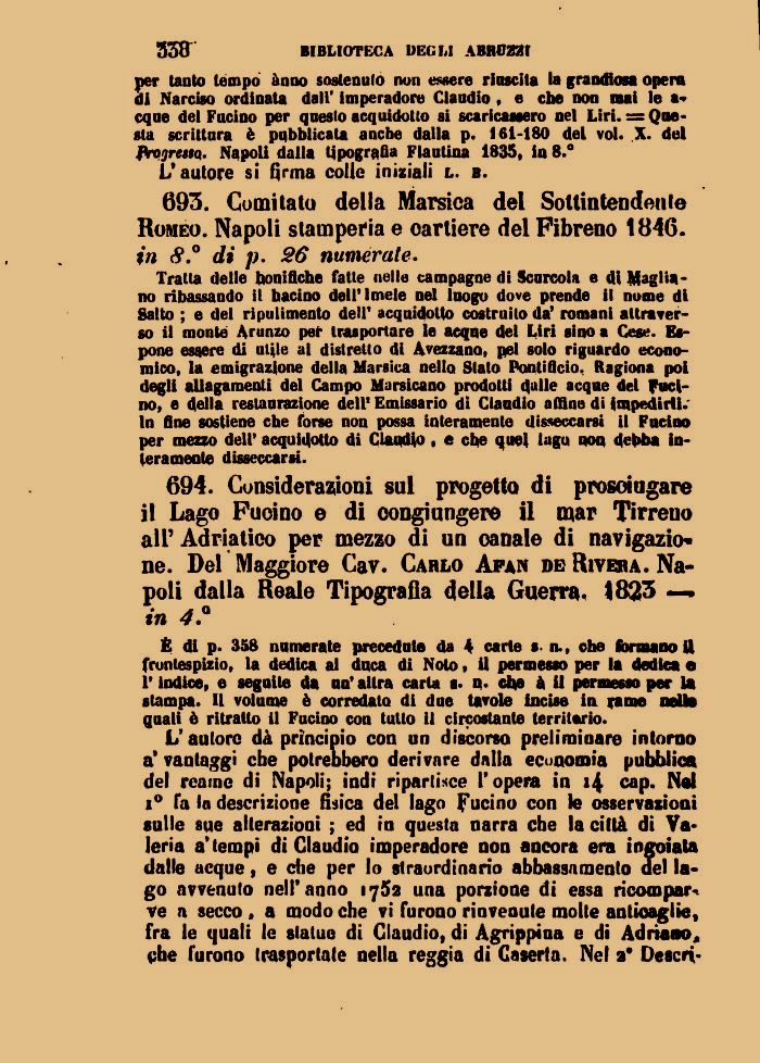 694. Considerazioni sul progetto di prosciugare il Lago Fucino e di oongiungere il mar Tirreno all' Adriatico per mezzo di un canale di navigazione. Del Maggiore Cav. Carlo Afan de Rivera. Napoli dalla Reale Tipografia della Guerra. 1823 — in 4.°