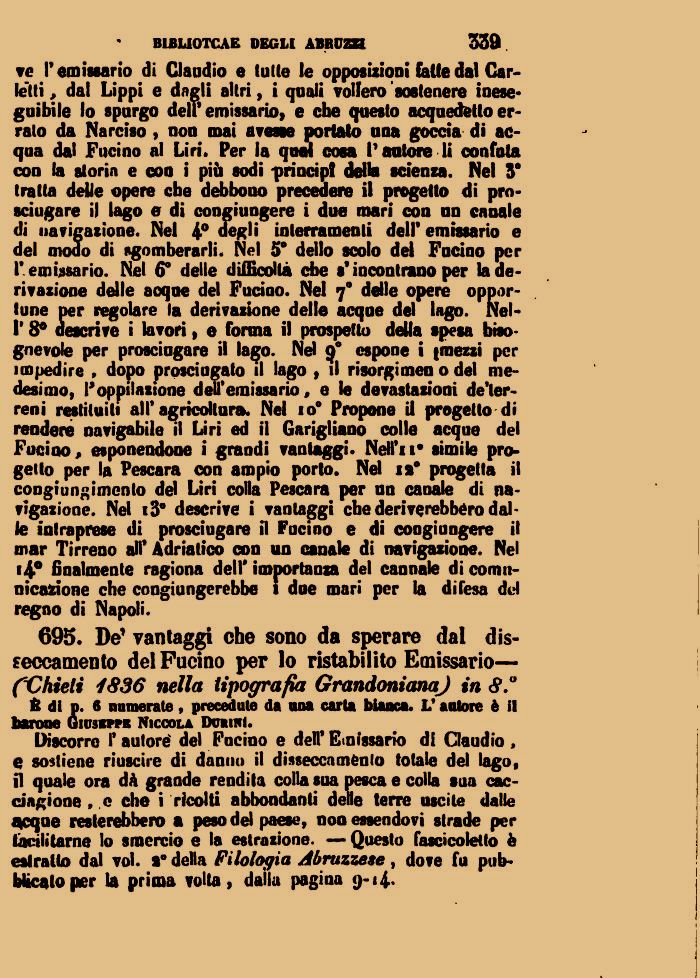 695. De' vantaggi che sono da sperare dal disseccamento del Fucino per lo ristabilito Emissario— ('Chieti 1836 nella tipografia GrandonianaJ in 8.°