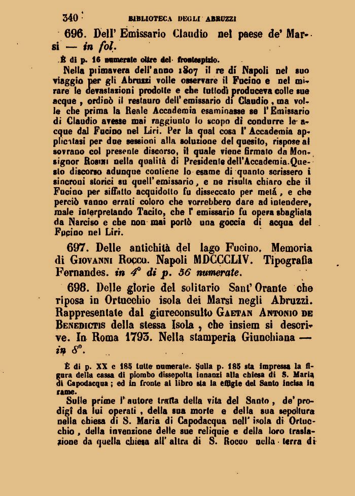 698. Delle glorie del solitario Sant'Orante che riposa in Ortucchio isola dei Marsi negli Abruzzi. Rappresentate dal giureconsulto Gaetan Antonio de Benedictis della stessa Isola , che insiem si descrive. In Roma 1793. Nella stamperia Giunchiana —