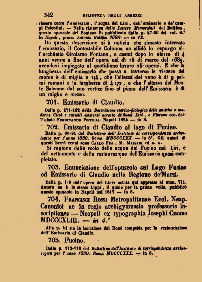 705. Enunciazione dell'opuscolo sul Lago Fucino ed Emissario di Claudio nella Regione de'Marsi.