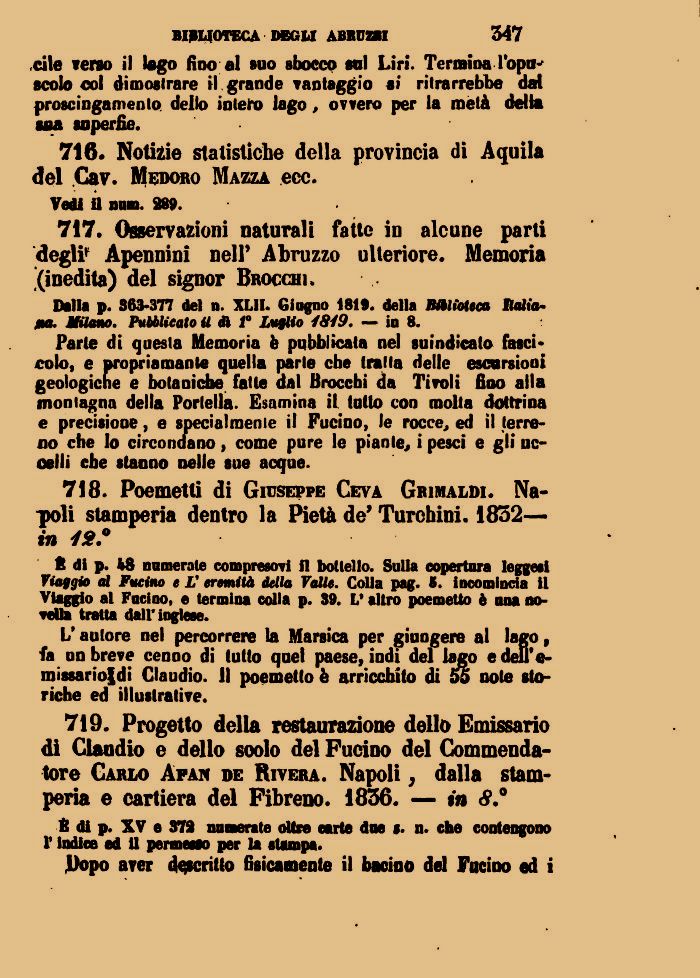 719. Progetto della restaurazione dello Emissario di Claudio e dello soolo del Fucino del Commendatore Carlo Afai* de Rivera. Napoli, dalla stamperia e cartiera del Fibreno. 1856. — in .°