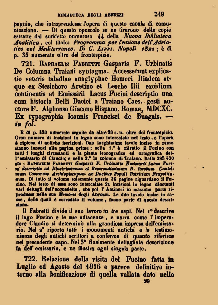 fi di p. 120 numerate seguite da altre 26 s. n. oltre del frontespizio. Gran numero di incisioni in légno sono intercalate nel testo, e l'opera č ripiena di antiche iscrizioni. Due larghissime tavole incise in rame stanno innanzi alla pagina prima ; nella 1.* č ritratto il Fucino con tutti ě luoghi circostanti e la pianta ieonografica ed ortografica dell'emissario di Claudio; e nella 2.' la colonna di Traiano. Dalla 385 420 sta : Raphael» Fabuktti Gasparis F. Urbinati» Emissarii Lacus Fucini descriptio ad Jlluetrissimum et Reverendissimum D. Iacobum Cantei« mum Caesareae Archiepiscopum t