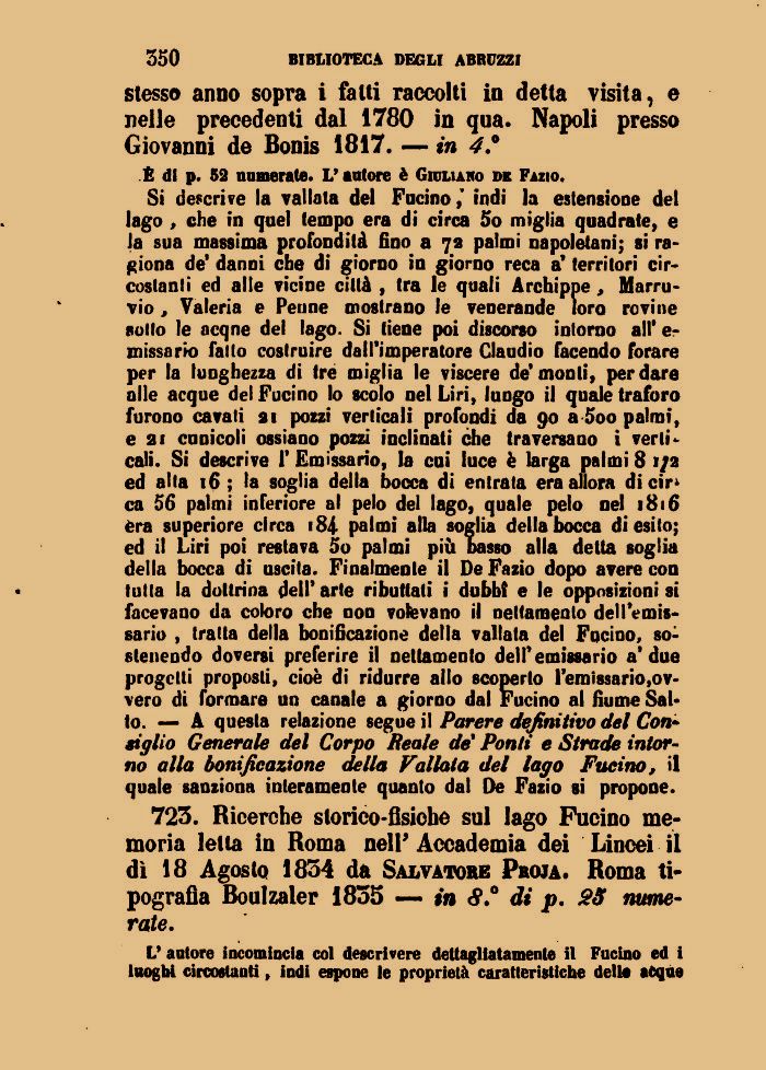 723. Ricerche storico-fisiche sul lago Fucino memoria letta in Roma neir Accademia dei Lincei il dì 18 Agosto 1834 da Salvatore Phoja. Roma tipografìa Boulzaler 18o5 — in <9.° di p. 2$ numerate.