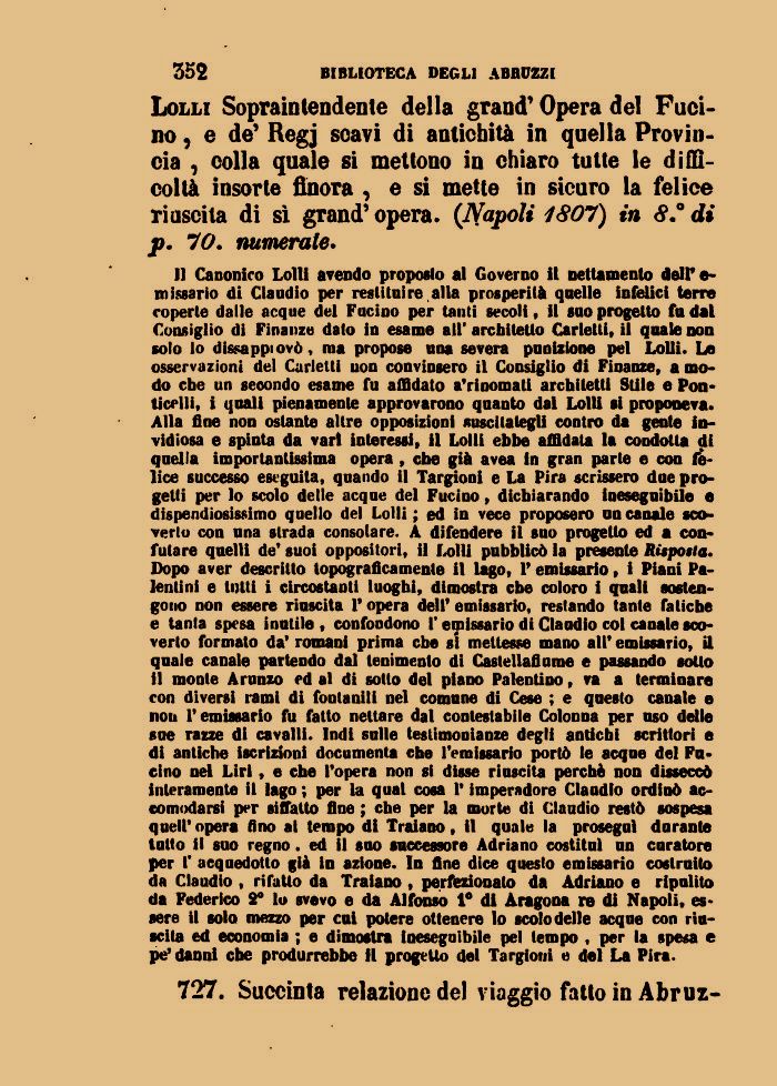 Lolli Sopraintendente della grand' Opera del Fucino , e de' Regj soavi di antichità in quella Provincia , colla quale si mettono in chiaro tutte le difficoltà insorte finora , e si mette in sicuro la felice riuscita di sì grand' opera. (Napoli 1801) in 8di p. 70. numerale.