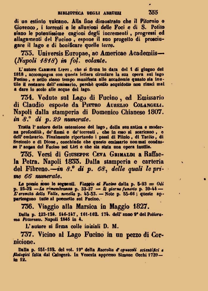 754. Vedute sul Lago di Fucino, ed Emissario di Claudio esposte da Pietro Aurelio Colangeli. Napoli dalla stamperia di Domenico Chianese 1807. in 8.° di p. 29 numerate.