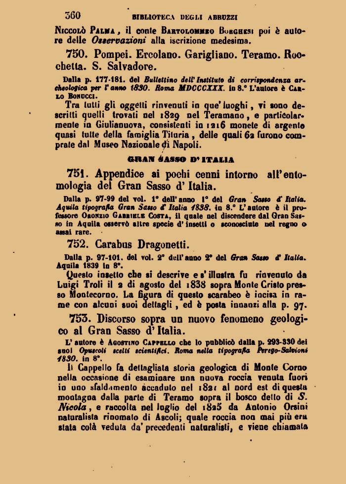 Il Cappello fa dettagliata storia geologica di Monte Corno nella occasione di esaminare una nuova roccia venuta fuori io uno sfaldamento accaduto nel 1821 al nord est di questa montagna dalla parte di Teramo sopra il bosco detto di S. Nicola, e raccolta nel luglio del i8a5 da Aotonio Orsini naturalista rinomato di Ascoli; quale roccia non mai più era stata colà veduta da' precedenti naturalisti, e viene chiamata
