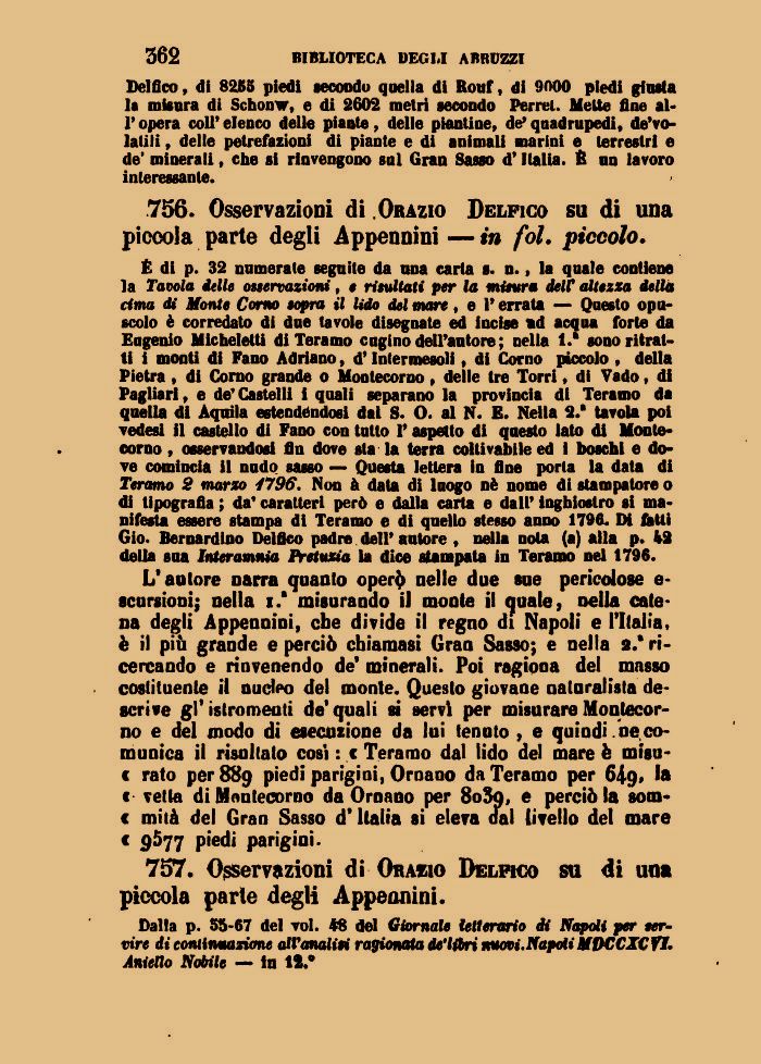 £ di p. 32 numerate seguile da una carta a. n., la quale contiene la Tavola ielle osservazioni, e risultati per la misura dell' altezza della cima di Monte Corno sopra il lido del mare, e l'errata — Questo opuscolo è corredato di due tavole disegnate ed incise ad acqua forte da Eugenio Micheletti di Teramo cugino dell'autore; nella 1.* sono ritratti i monti di Fano Adriano, d'Intermesoli, di Corno piccolo , della Pietra f di Corno grande o Mootecorno, delle tre Torri, di Vado, di Pagliari, e de'Castelli i quali separano la provincia di Teramo da quella di Aquila estendendosi dal S. O. al N. E. Nella 2.* tavola poi vedesi il castello di Fano con tutto l'aspetto di questo lato di Monte-corno , osservandosi fin dove sta la terra coltivabile ed i boschi e dove comincia il nudo sasso — Questa lettera in fine porta la data di Teramo 2 marzo 4796. Non à data di luogo nè nome di stampatore o di tipografia ; da' caratteri però e dalla carta e dall' inghiostro si manifesta essere stampa di Teramo e di quello stesso anno 1796. Di Atti Gio. Bernardino Delfico padre dell' autore , nella nota (a) alla p. hi della sua Interamnia Pretuzia la dice stampata in Teramo nel 1796.