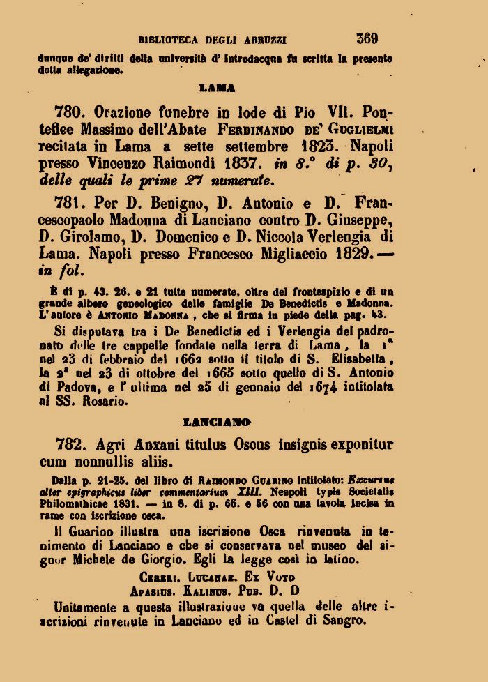 780. Orazione funebre in lode di Pio VII. Pontefice Massimo dell'Abate Ferdinando de' Guglielmi recitata in Lama a sette settembre 1823. Napoli presso Vincenzo Raimondi 1837. in 8° di p. 30, delle quali le prime Ti numerate.