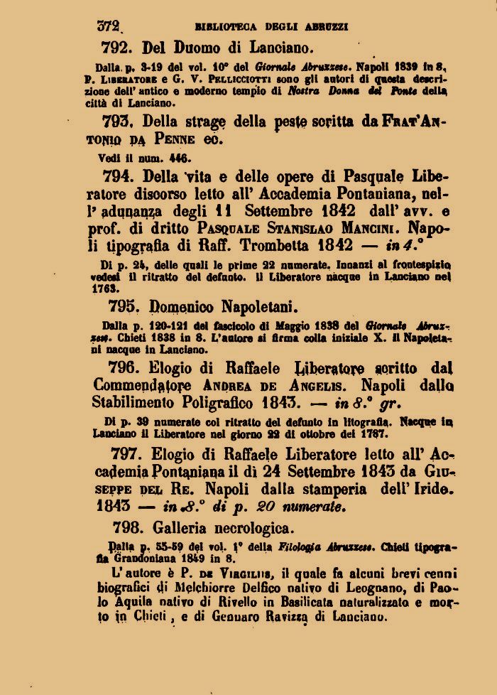797. Elogio di Raffaele Liberatore letto all' Accademia Pontaniana il dì 24 Settembre 1843 da Giuseppe del Re. Napoli dalla stamperia dell' Iride. 1843 — in di p. SO numerate.
