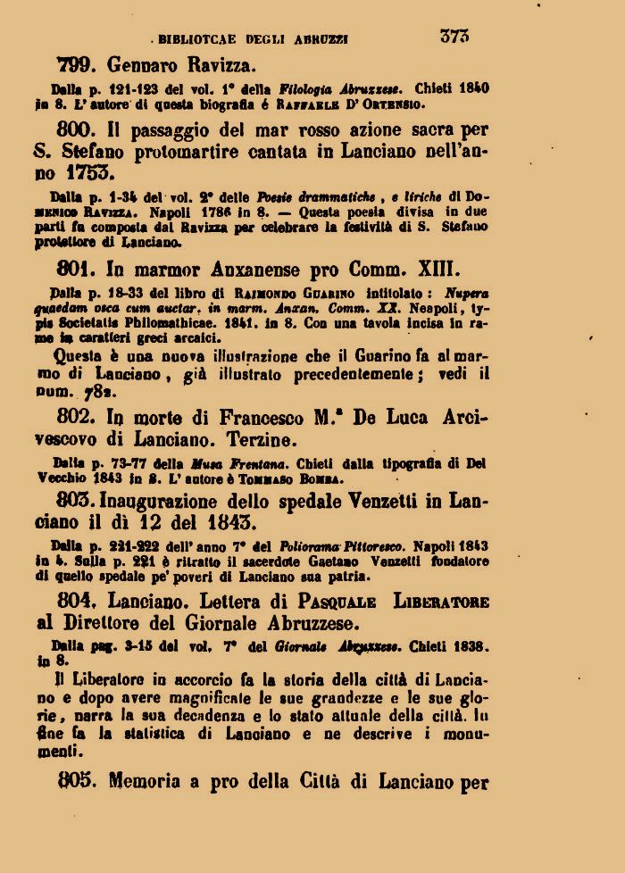 11 Liberatore in accorcio fa la storia della città di Lanciano e dopo avere magnificale le sue grandezze e le sue glorie, narra la sua decadenza e lo stato attuale della città. In Ine fa la statistica di Lanciano e ne descrive i monumenti.