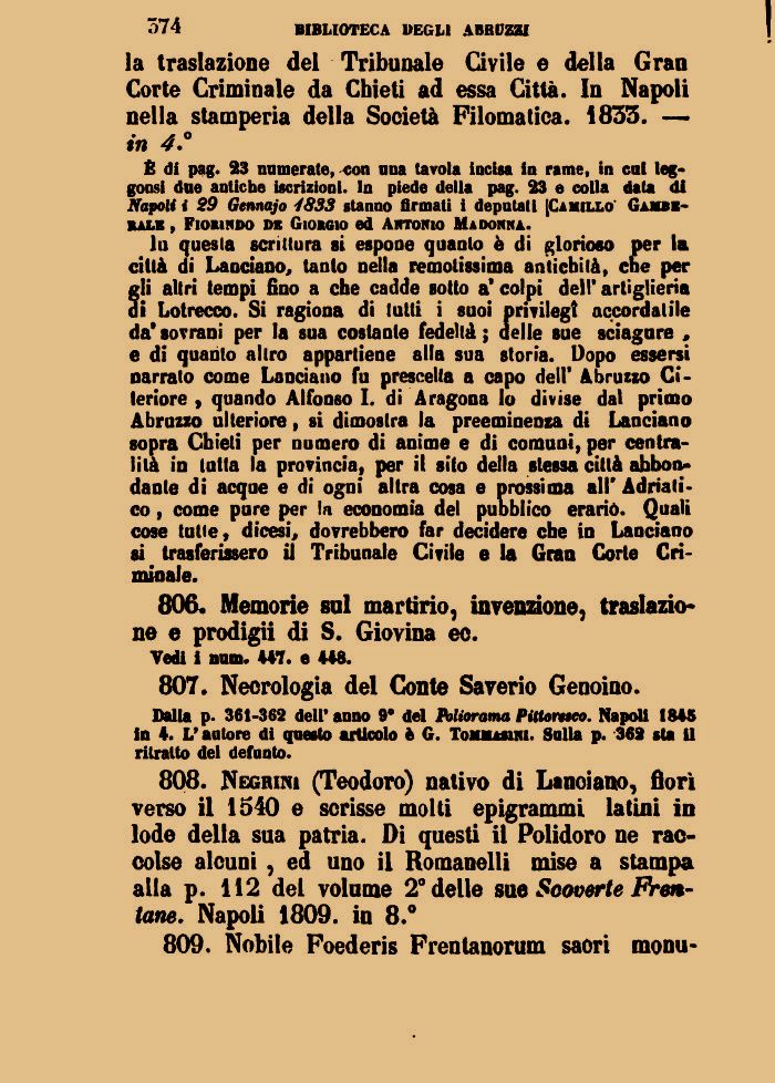 808. Neghimi (Teodoro) nativo di Lanoiano, fiorì verso il 1540 e scrisse molti epigrammi latini in lode della sua patria. Di questi il Polidoro ne raccolse alcuni , ed uno il Romanelli mise a stampa alla p. 112 del volume 2° delle sue Sooverte Frettane. Napoli 1809. in 8.°