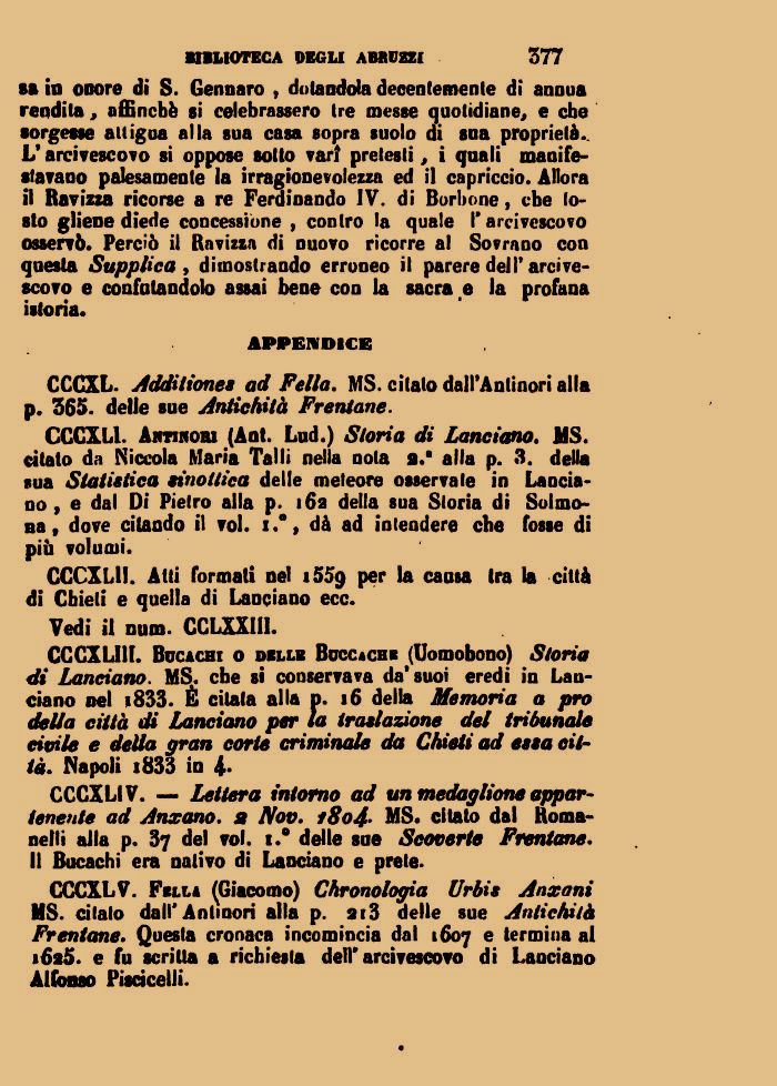CCCXL V. Fklla (Giacomo) Chronologia Urbis Anxani MS. citalo dall'Antinori alla p. 2(3 delle sue Antichità Frentane. Questa cronaca incomincia dal 1607 e termina ai 1625. e fu scritta a richiesta dell'arcivescovo di Lanciano Alfonso Pisciceli!'.