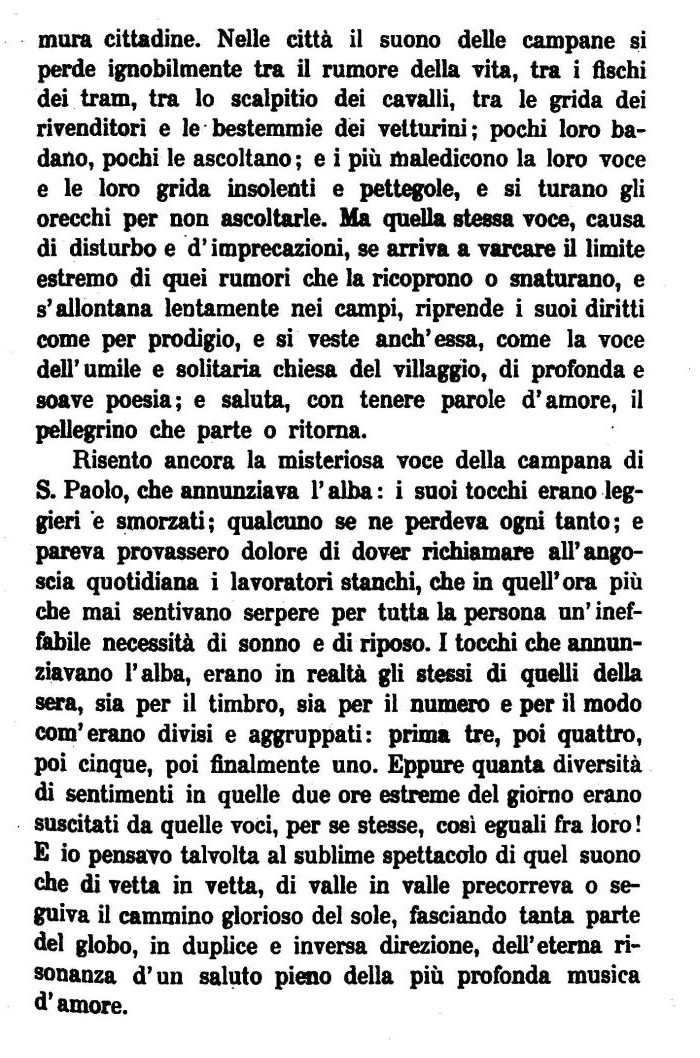 Risento ancora la misteriosa voce della campana di S. Paolo, che annunziava l'alba : i suoi tocchi erano leggieri e smorzati; qualcuno se ne perdeva ogni tanto; e pareva provassero dolore di dover richiamare all'angoscia quotidiana i lavoratori stanchi, che in quell'ora più che mai sentivano serpere per tutta la persona un' ineffabile necessità di sonno e di riposo. I tocchi che annunziavano l'alba, erano in realtà gli stessi di quelli della sera, sia per il timbro, sia per il numero e per il modo com'erano divisi e aggruppati: prima tre, poi quattro, poi cinque, poi finalmente uno. Eppure quanta diversità di sentimenti in quelle due ore estreme del giorno erano suscitati da quelle voci, per se stesse, così eguali fra loro ! E io pensavo talvolta al sublime spettacolo di quel suono che di vetta in vetta, di valle in valle precorreva o seguiva il cammino glorioso del sole, fasciando tanta parte del globo, in duplice e inversa direzione, dell'eterna risonanza d'un saluto pieno della più profonda musica d'amore.