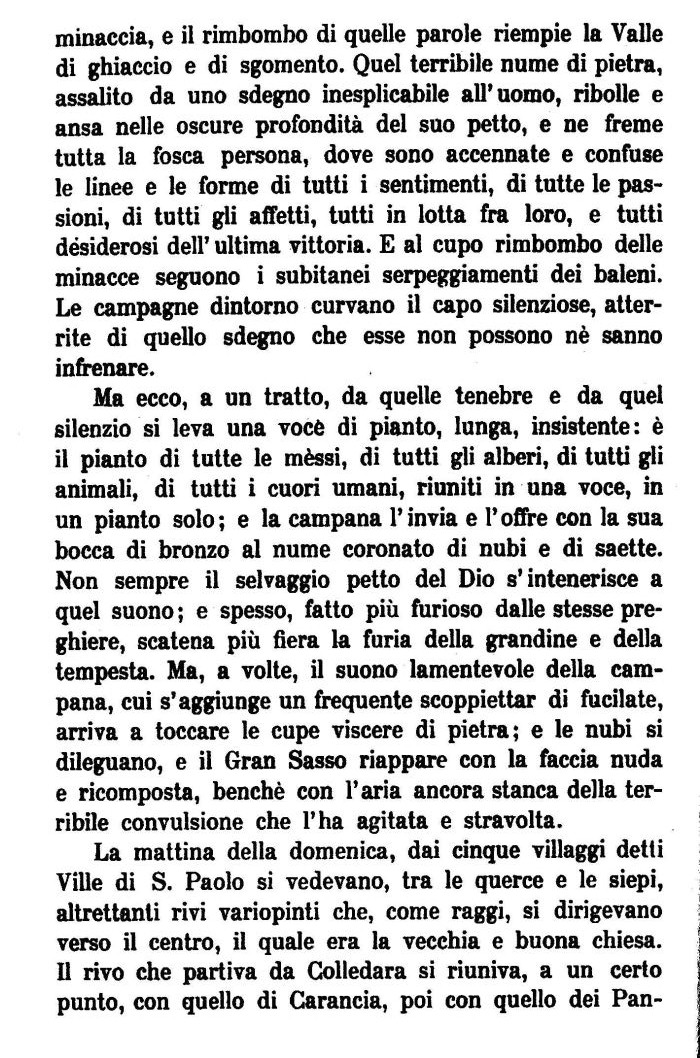 Ma ecco, a un tratto, da quelle tenebre e da quel silenzio si leva una vocè di pianto, lunga, insistente: è il pianto di tutte le mèssi, di tutti gli alberi, di tutti gli animali, di tutti i cuori umani, riuniti in una voce, in un pianto solo; e la campana l'invia e l'offre con la sua bocca di bronzo al nume coronato di nubi e di saette. Non sempre il selvaggio petto del Dio s'intenerisce a quel suono; e spesso, fatto più furioso dalle stesse preghiere, scatena più fiera la furia della grandine e della tempesta. Ma, a volte, il suono lamentevole della campana, cui s'aggiunge un frequente scoppiettar di fucilate, arriva a toccare le cupe viscere di pietra; e le nubi si dileguano, e il Gran Sasso riappare con la faccia nuda e ricomposta, benché con l'aria ancora stanca della terribile convulsione che l'ha agitata e stravolta.