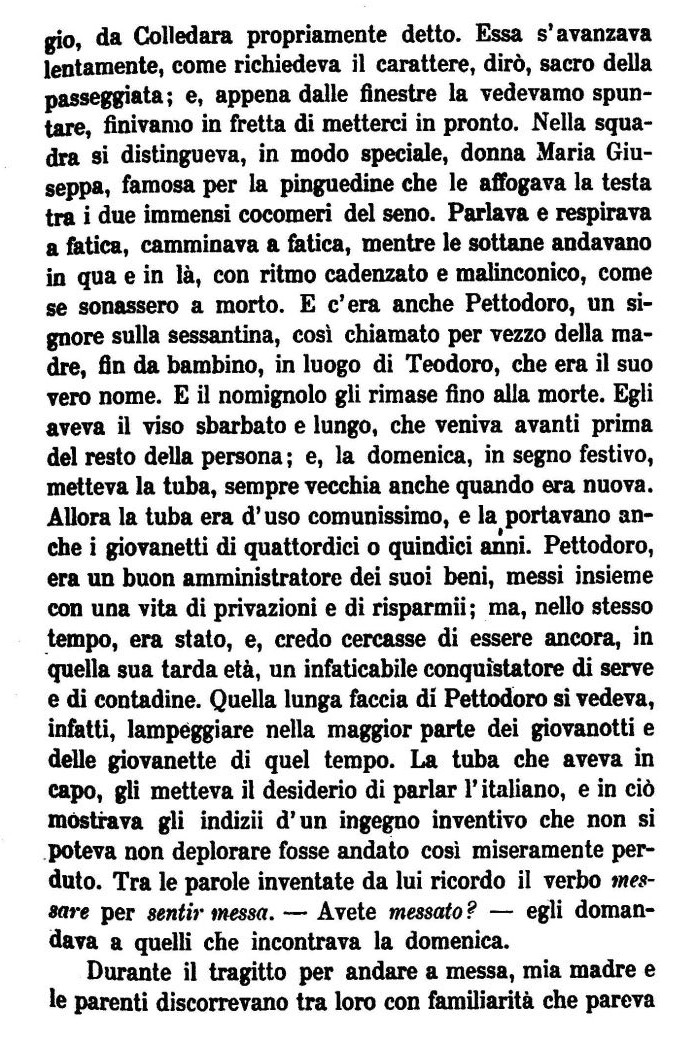 gio, da Cblledara propriamente detto. Essa s'avanzava lentamente, come richiedeva il carattere, diṛ, sacro della passeggiata; e, appena dalle finestre la vedevamo spuntare, finivamo in fretta di metterci in pronto. Nella squadra si distingueva, in modo speciale, donna Maria Giuseppa, famosa per la pinguedine che le affogava la testa tra i due immensi cocomeri del seno. Parlava e respirava a fatica, camminava a fatica, mentre le sottane andavano in qua e in là, con ritmo cadenzato e malinconico, come se sonassero a morto. E c'era anche Pettodoro, un signore sulla sessantina, coś chiamato per vezzo della madre, fin da bambino, in luogo di Teodoro, che era il suo vero nome. E il nomignolo gli rimase fino alla morte. Egli aveva il viso sbarbato e lungo, che veniva avanti prima del resto della persona ; e, la domenica, in segno festivo, metteva la tuba, sempre vecchia anche quando era nuova. Allora la tuba era d'uso comunissimo, e la portavano anche i giovanetti di quattordici o quindici anni. Pettodoro, era un buon amministratore dei suoi beni, messi insieme con una vita di privazioni e di risparmii; ma, nello stesso tempo, era stato, e, credo cercasse di essere ancora, in quella sua tarda età, un infaticabile conquistatore di serve e di contadine. Quella lunga faccia di Pettodoro si vedeva, infatti, lampeggiare nella maggior parte dei giovanotti e delle giovanette di quel tempo. La tuba che aveva in capo, gli metteva il desiderio di parlar l'italiano, e in cị mostrava gli indizii d'un ingegno inventivo che non si poteva non deplorare fosse andato coś miseramente perduto. Tra le parole inventate da lui ricordo il verbo messore per sentir messa. — Avete messato ? — egli domandava a quelli che incontrava la domenica.