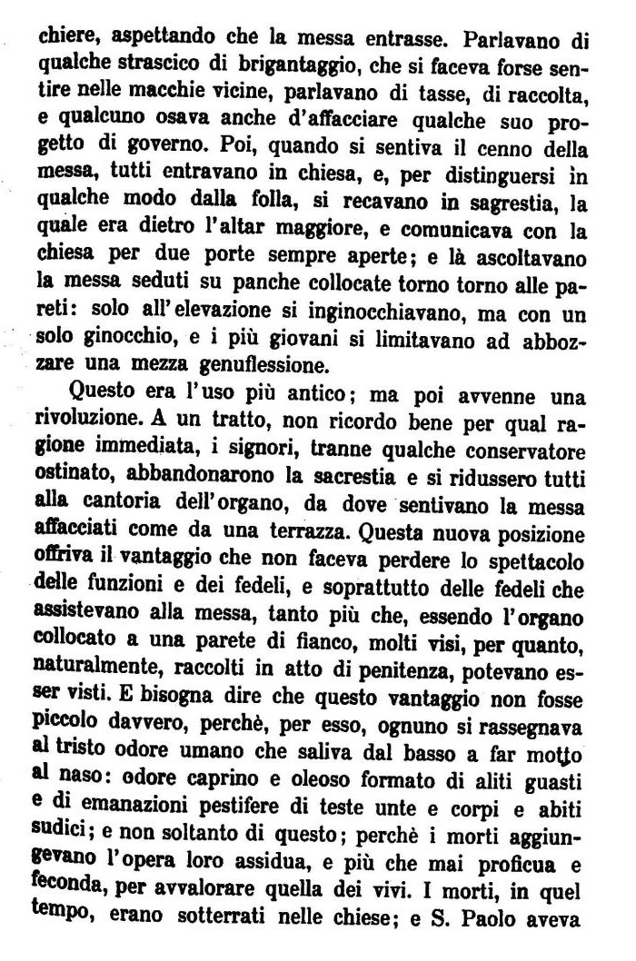 Questo era l'uso pił antico; ma poi avvenne una rivoluzione. A un tratto, non ricordo bene per qual ragione immediata, i signori, tranne qualche conservatore ostinato, abbandonarono la sacrestia e si ridussero tutti alla cantoria dell'organo, da dove sentivano la messa affacciati come da una terrazza. Questa nuova posizione offriva il vantaggio che non faceva perdere Io spettacolo delle funzioni e dei fedeli, e soprattutto delle fedeli che assistevano alla messa, tanto pił che, essendo l'organo collocato a una parete di fianco, molti visi, per quanto, naturalmente, raccolti in atto di penitenza, potevano esser visti. E bisogna dire che questo vantaggio non fosse piccolo davvero, perchč, per esso, ognuno si rassegnava al tristo odore umano che saliva dal basso a far motjo al naso: odore caprino e oleoso formato di aliti guasti e di emanazioni pestifere di teste unte e corpi e abiti sudici ; e non soltanto di questo ; perchč i morti aggiungevano l'opera loro assidua, e pił che mai proficua e feconda, per avvalorare quella dei vivi. I morti, in quel tempo, erano sotterrati nelle chiese; e S. Paolo aveva