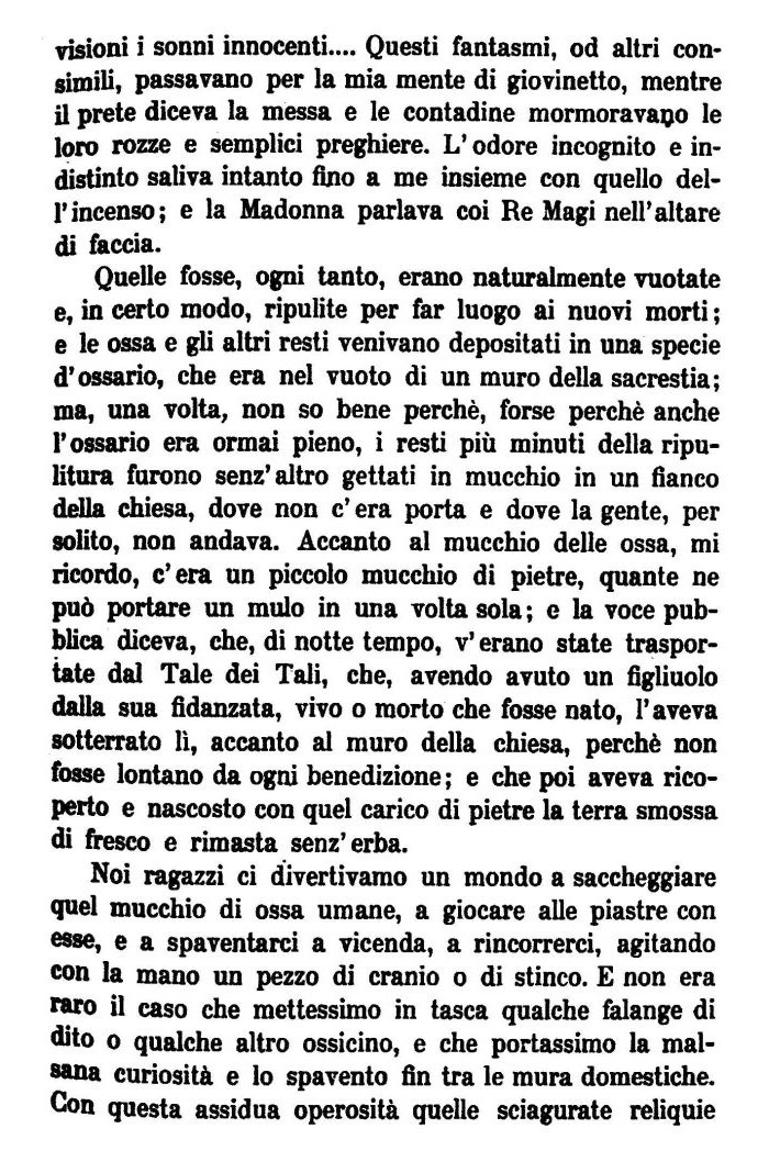 Noi ragazzi ci divertivamo un mondo a saccheggiare quel mucchio di ossa umane, a giocare alle piastre con esse, e a spaventarci a vicenda, a rincorrerci, agitando con la mano un pezzo di cranio o di stinco. E non era raro il caso che mettessimo in tasca qualche falange di dito o qualche altro ossicino, e che portassimo la malsana curiosità e lo spavento fin tra le mura domestiche. Con questa assidua operosità quelle sciagurate reliquie