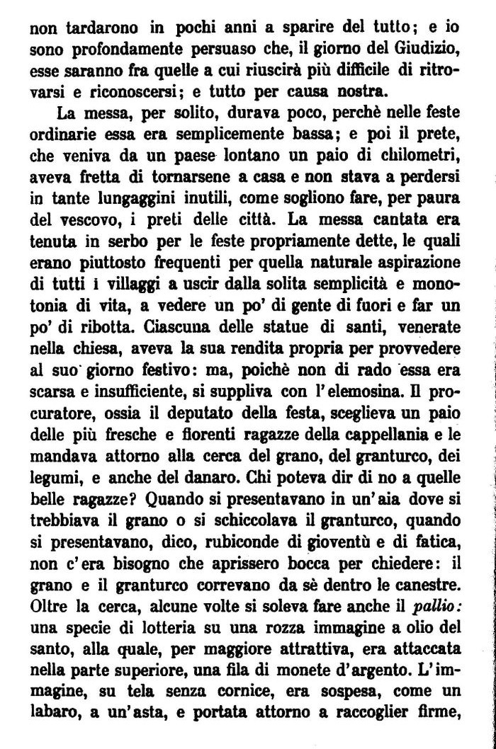 La messa, per solito, durava poco, perchè nelle feste ordinarie essa era semplicemente bassa; e poi il prete, che veniva da un paese lontano un paio di chilometri, aveva fretta di tornarsene a casa e non stava a perdersi in tante lungaggini inutili, come sogliono fare, per paura del vescovo, i preti delie città. La messa cantata era tenuta in serbo per le feste propriamente dette, le quali erano piuttosto frequenti per quella naturale aspirazione di tutti i villaggi a uscir dalla solita semplicità e monotonia di vita, a vedere un po' di gente di fuori e far un po' di ribotta. Ciascuna delle statue di santi, venerate nella chiesa, aveva la sua rendita propria per provvedere al suo giorno festivo: ma, poiché non di rado essa era scarsa e insufficiente, si suppliva con l'elemosina. Il procuratore, ossia il deputato della festa, sceglieva un paio delle più fresche e fiorenti ragazze della cappellania e le mandava attorno alia cerca del grano, del granturco, dei legumi, e anche del danaro. Chi poteva dir di no a quelle belle ragazze? Quando si presentavano in un' aia dove si trebbiava il grano o si schiccolava il granturco, quando si presentavano, dico, rubiconde di gioventù e di fatica, non c'era bisogno che aprissero bocca per chiedere: il grano e il granturco correvano da sè dentro le canestre. Oltre la cerca, alcune volte si soleva fare anche il pallio: una specie di lotteria su una rozza immagine a olio del santo, alla quale, per maggiore attrattiva, era attaccata nella parte superiore, una fila di monete d'argento. L'immagine, su tela senza cornice, era sospesa, come un labaro, a un'asta, e portata attorno a raccoglier firme,