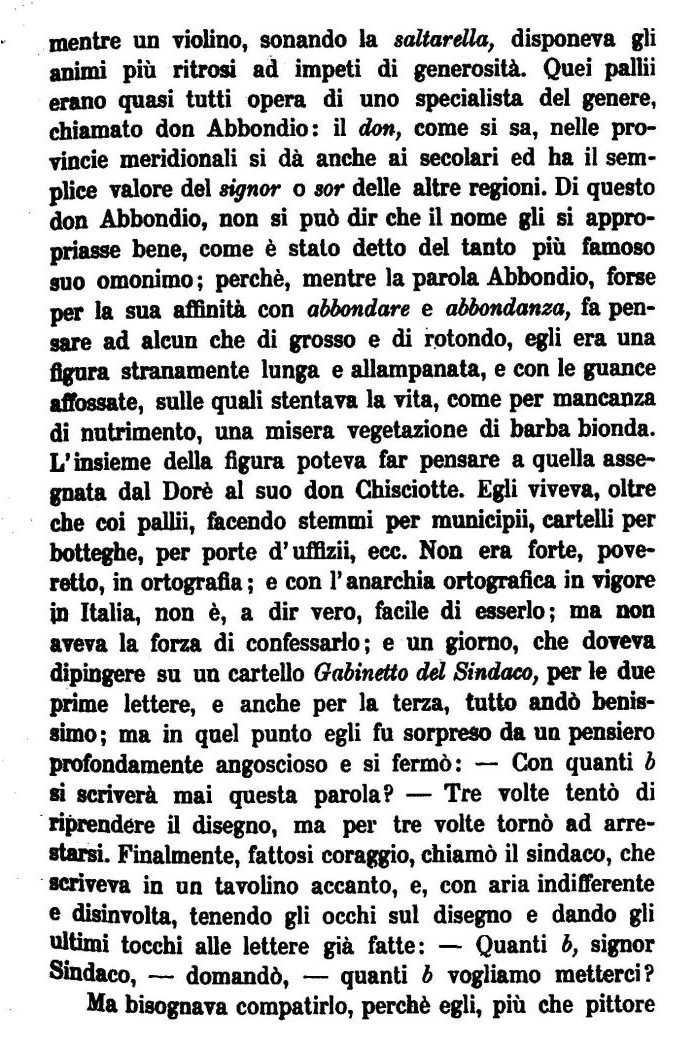 mentre un violino, sonando la saltarella, disponeva gli animi più ritrosi ad impeti di generosità. Quei pallii erano quasi tutti opera di uno specialista del genere, chiamato don Abbondio: il don, come si sa, nelle Provincie meridionali si dà anche ai secolari ed ha il semplice valore del signor o sor delle altre regioni. Di questo don Abbondio, non si può dir che il nome gli si appropriasse bene, come è stato detto del tanto più famoso suo omonimo ; perchè, mentre la parola Abbondio, forse per la sua affinità con abbondare e abbondanza, fa pensare ad alcun che di grosso e di rotondo, egli era una figura stranamente lunga e allampanata, e con le guance affossate, sulle quali stentava la vita, come per mancanza di nutrimento, una misera vegetazione di barba bionda. L'insieme della figura poteva far pensare a quella assegnata dal Dorè al suo don Chisciotte. Egli viveva, oltre che coi pallii, facendo stemmi per municipii, cartelli per botteghe, per porte d'uffizii, ecc. Non era forte, poveretto, in ortografia ; e con l'anarchia ortografica in vigore In Italia, non è, a dir vero, facile di esserlo; ma non aveva la forza di confessarlo; e un giorno, che doveva dipingere su un cartello Gabinetto del Sindaco, per le due prime lettere, e anche per la terza, tutto andò benissimo; ma in quel punto egli fu sorpreso da un pensiero profondamente angoscioso e si fermò: — Con quanti b si scriverà mai questa parola? — Tre volte tentò di riprendere il disegno, ma per tre volte tornò ad arrestarsi. Finalmente, fattosi coraggio, chiamò il sindaco, che scriveva in un tavolino accanto, e, con aria indifferente e disinvolta, tenendo gli occhi sul disegno e dando gli ultimi tocchi alle lettere già fatte: — Quanti b, signor Sindaco, — domandò, — quanti b vogliamo metterci?