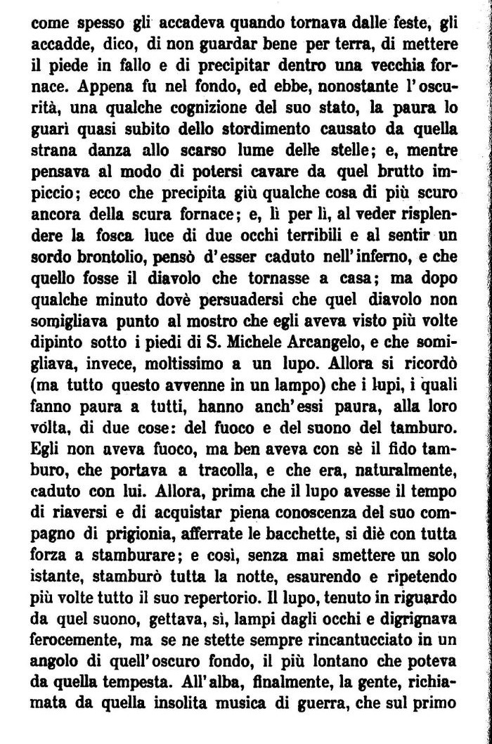 come spesso gli accadeva quando tornava dalle feste, gli accadde, dico, di non guardar bene per terra, di mettere il piede in fallo e di precipitar dentro una vecchia fornace. Appena fu nel fondo, ed ebbe, nonostante l'oscurità, una qualche cognizione del suo stato, la paura lo guari quasi subito delio stordimento causato da quella strana danza allo scarso lume delle stelle; e, mentre pensava al modo di potersi cavare da quel brutto impiccio; ecco che precipita giù qualche cosa di più scuro ancora della scura fornace ; e, li per lì, al veder risplendere la fosca luce di due occhi terribili e al sentir un sordo brontolio, pensò d'esser caduto nell'inferno, e che quello fosse il diavolo che tornasse a casa; ma dopo qualche minuto dovè persuadersi che quel diavolo non somigliava punto al mostro che egli aveva visto più volte dipinto sotto i piedi di S. Michele Arcangelo, e che somigliava, invece, moltissimo a un lupo. Allora si ricordò (ma tutto questo avvenne in un lampo) che i lupi, i quali fanno paura a tutti, hanno anch'essi paura, alla loro volta, di due cose: del fuoco e del suono del tamburo. Egli non aveva fuoco, ma ben aveva con sè il fido tamburo, che portava a tracolia, e che era, naturalmente, caduto con lui. Allora, prima che il lupo avesse il tempo di riaversi e di acquistar piena conoscenza del suo compagno di prigionia, afferrate le bacchette, si diè con tutta forza a stamburare ; e così, senza mai smettere un solo istante, stamburò tutta la notte, esaurendo e ripetendo più volte tutto il suo repertorio. Il lupo, tenuto in riguardo da quel suono, gettava, sì, lampi dagli occhi e digrignava ferocemente, ma se ne stette sempre rincantucciato in un angolo di quell'oscuro fondo, il più lontano che poteva da quella tempesta. All'alba, finalmente, la gente, richiamata da quella insolita musica di guerra, che sul primo
