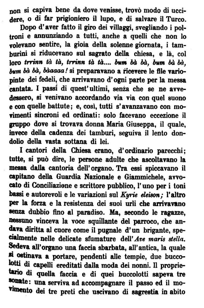 Dopo d'aver fatto il giro dei villaggi, svegliando i poltroni e annunziando a tutti, anche a quelli che non lo volevano sentire, la gioia della solenne giornata, i tamburini si riducevano sul sagrato della chiesa, e là, col loro trrinn tà tà, tnrinn tà tà.... bum bà bà, bum bà bà, bum bà bà, bàaaaa! si preparavano a ricevere le file variopinte dei fedeli, che arrivavano d'ogni parte per la messa cantata. I passi di quest'ultimi, senza che se ne avvedessero, si venivano accordando via via con quel suono e con quelle battute; e, così, tutti s'avanzavano con movimenti sincroni ed ordinati: solo facevano eccezione il gruppo dove si trovava donna Maria Giuseppa, il quale, invece della cadenza dei tamburi, seguiva il lento dondolio della vasta sottana di lei.